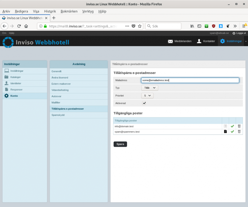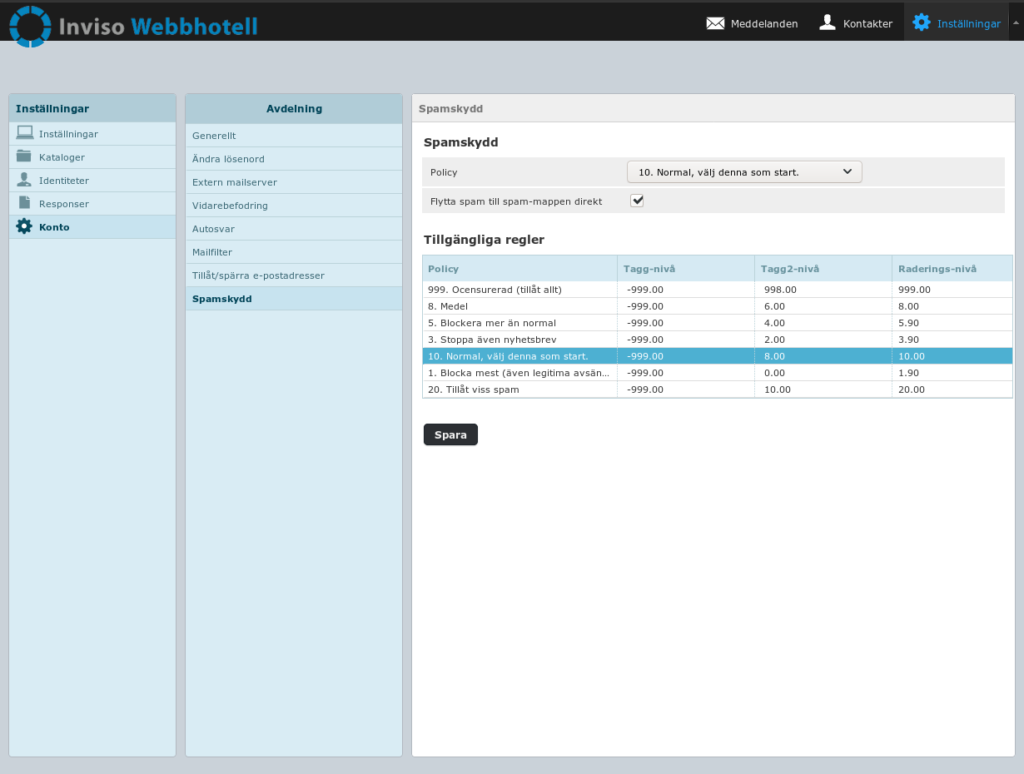 Klicka först på inställningar/konto/ sen Spamskydd.
