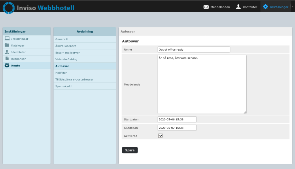*Klicka på Meddelanden och testskicka till dig själv eller från annat konto så att du vet att autosvar fungerar korrekt.