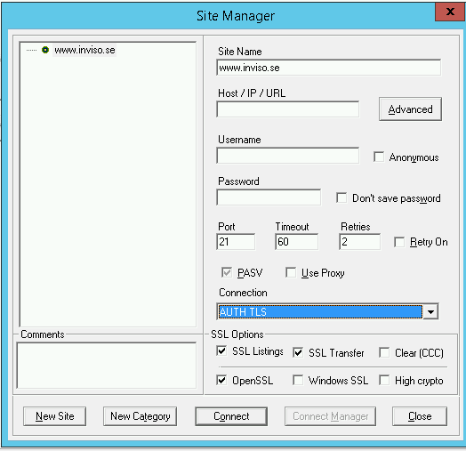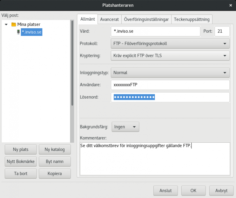 Ställ in följande då du använder Filezilla Klient https://filezilla-project.org/ mot våra inviso.se webbservers, funkar säkert liknande med andra FTP-klienter.